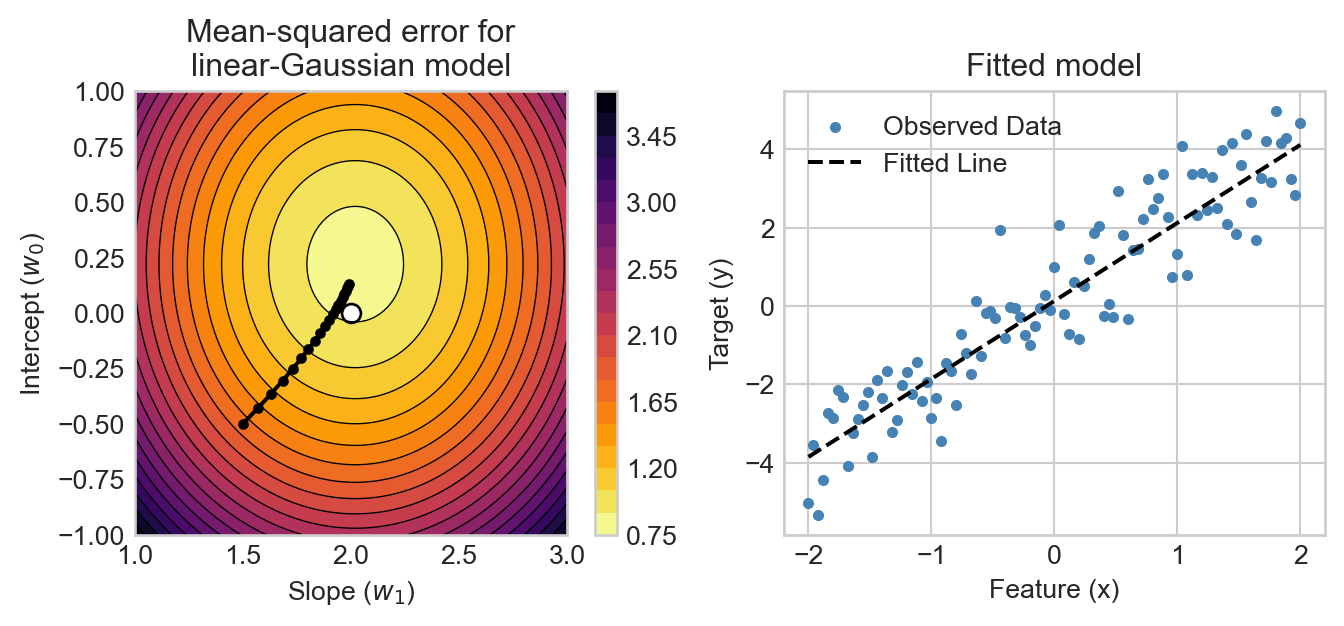 Figure 2.4 shows the trajectory of the gradient descent algorithm on the negative log-likelihood surface, ultimately landing near the minimal value of the MSE and close to the true parameters used to generate the data. We also show the fitted linear model corresponding to the final estimates of \(w_0\) and \(w_1\), which visually agrees well with the data.