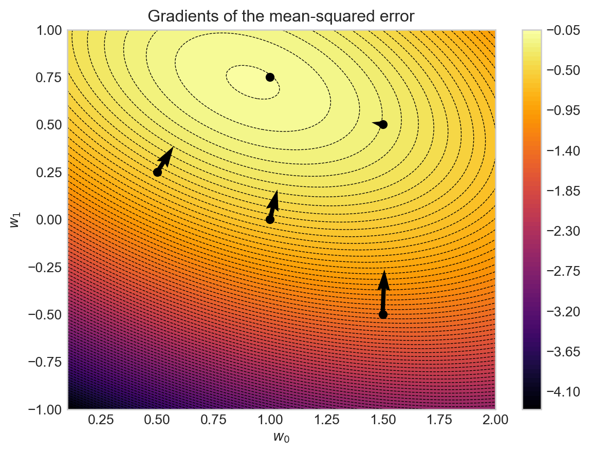 Figure 2.1: Visualization of the gradients of the mean-squared error function with respect to the parameters \(w_0\) and \(w_1\). The background color indicates the value of the mean-squared error, with lighter colors representing higher values. Dotted curves give contours along which the function is constant. The black arrows represent the gradients at various points in the \((w_0, w_1)\) space, pointing in the direction of greatest increase of the mean-squared error function.
