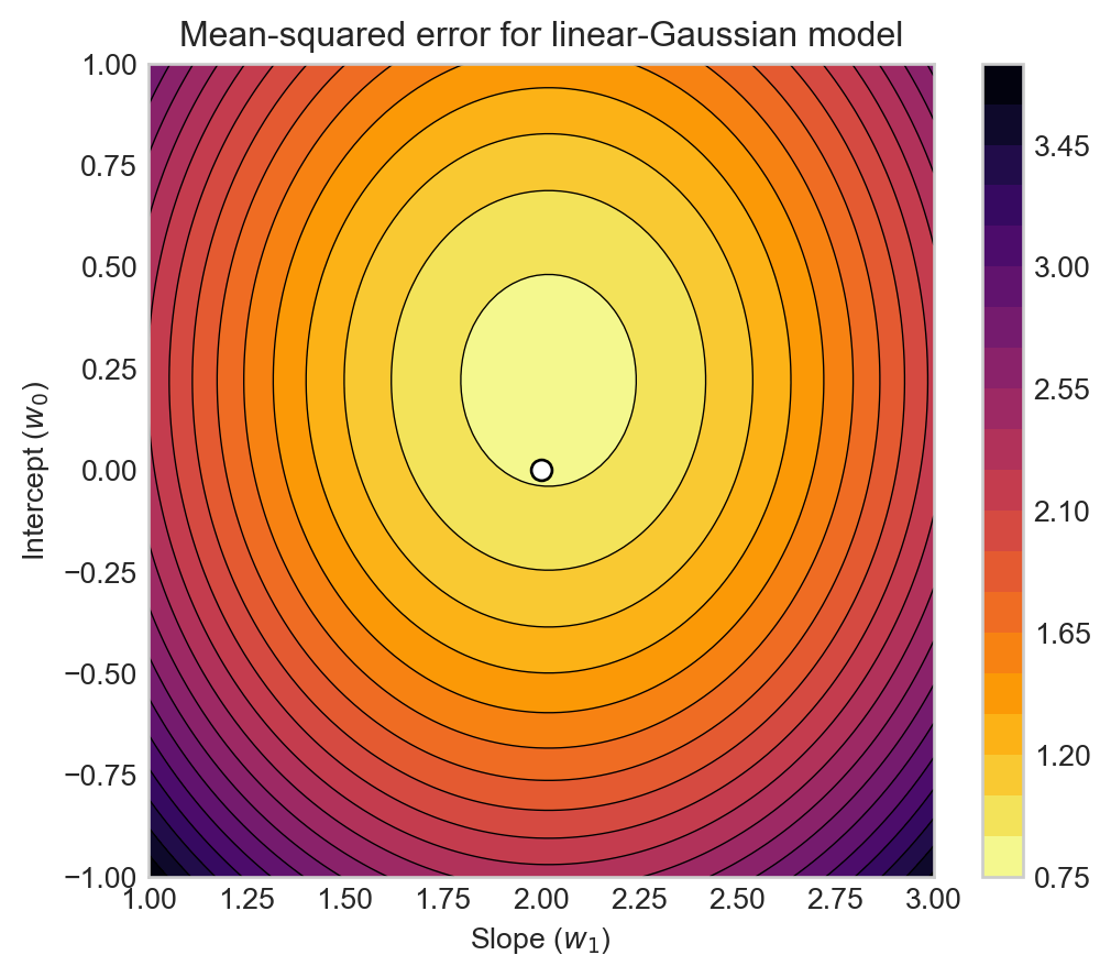 Figure 2.3: Mean-squared error \(R(\mathbf{x}, \mathbf{y}; w_0, w_1)\) for the linear-Gaussian model as a function of the intercept \(w_0\) and slope \(w_1\) with the data shown in Figure 2.2. The dot indicates the location of the true parameters used to generate the data.