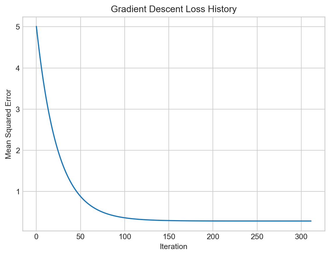 Looks fine! Now that we have gradient descent implemented, we can consider the gradient descent algorithm itself. This time, we’ll implement gradient descent as two functions: one which performs a single step of gradient descent, and one which handles the main loop, including storing values of the loss and checking for convergence.