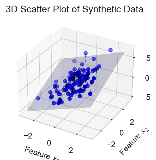Here’s a visualization of a regression model with two features, \(x_1\) and \(x_2\), alongside the plane defined by the linear function of these features.