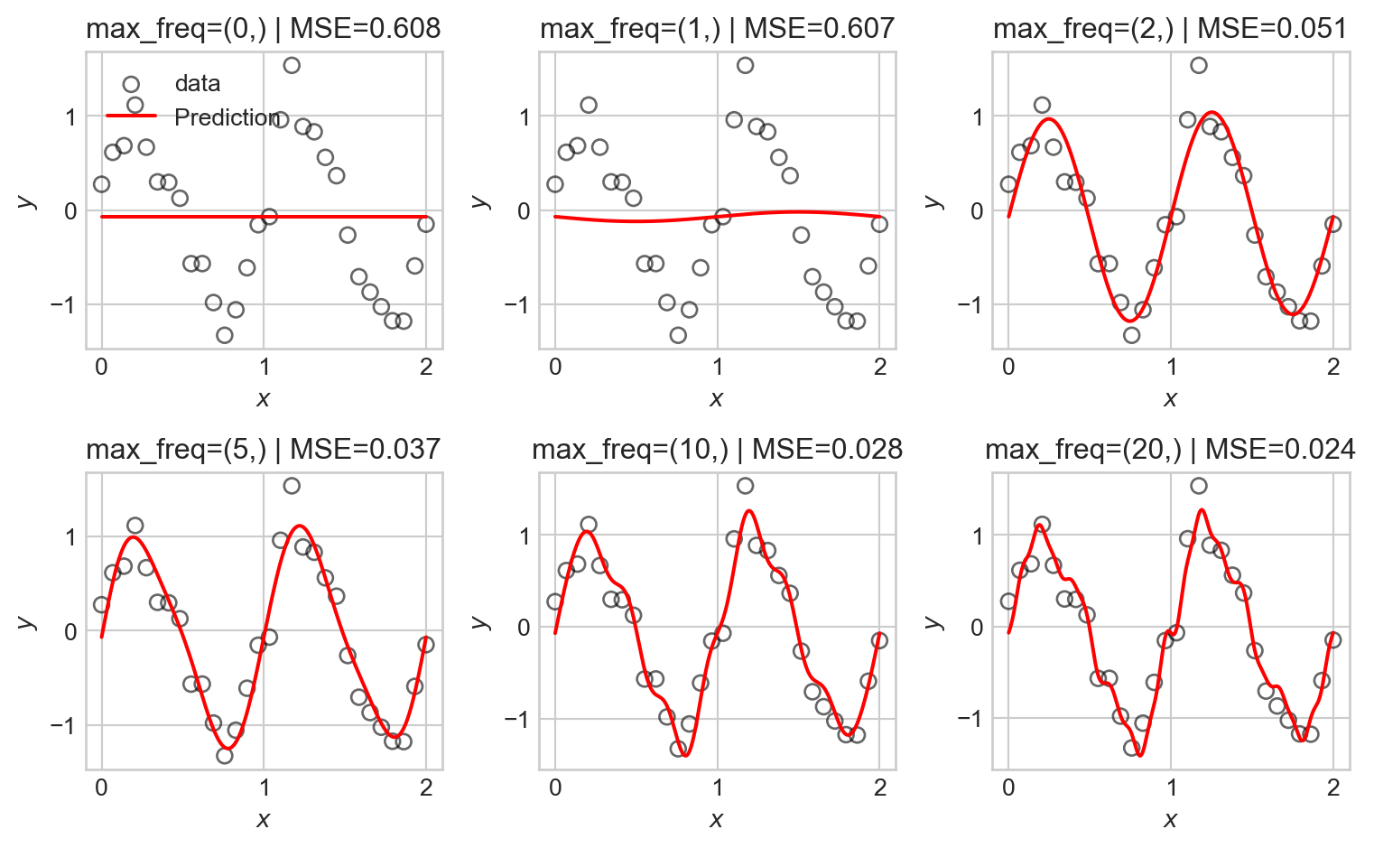 viz_model_predictions(LR, X, y, basis_fun = sinusoidal_features, ax=ax, max_freq=max_freqs[i])