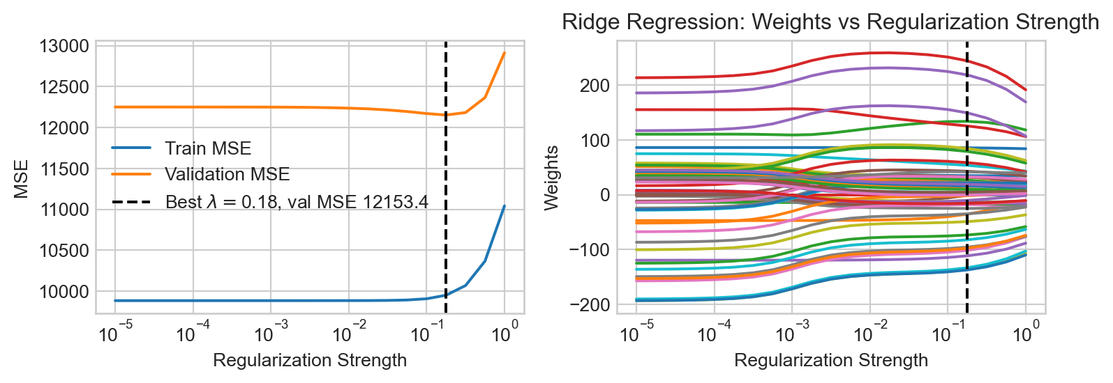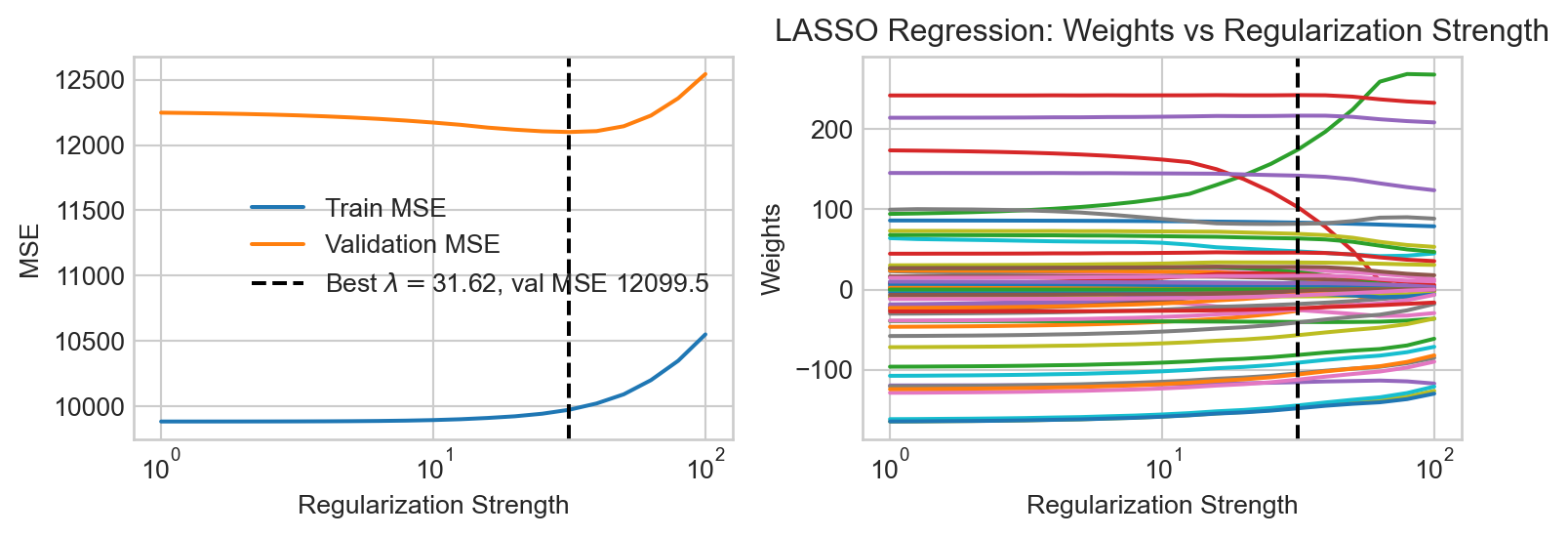 Let’s train the LASSO model one last time with the best regularization strength and take a look at the learned coefficients: