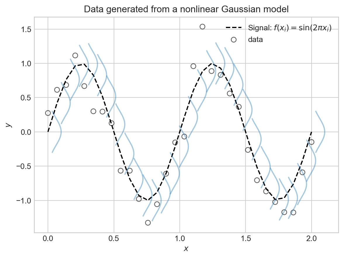 Definition 4.1 A nonlinear Gaussian model with mean function \(f\) and variance \(\sigma^2\) is a probabilistic model for data \((\mathbf{x}_i, y_i)_{i=1}^n\) such that