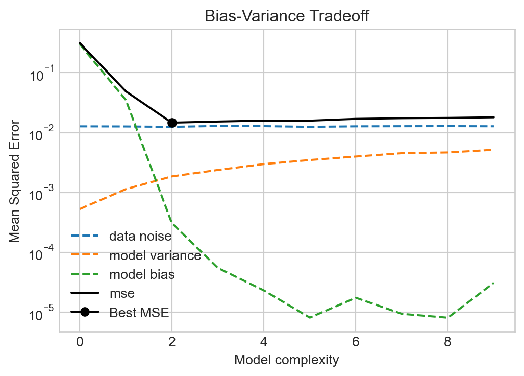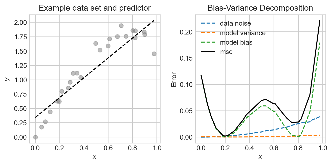 The model variance \(\mathrm{Var}(\hat{Y})\) captures how much the prediction \(\hat{Y}\) varies across different data sets and fitted models. If the model is very sensitive to the particular data set it is trained on, then the model variance will be high. Models which are more flexible (e.g. by having more parameters and features) tend to have higher model variance.
