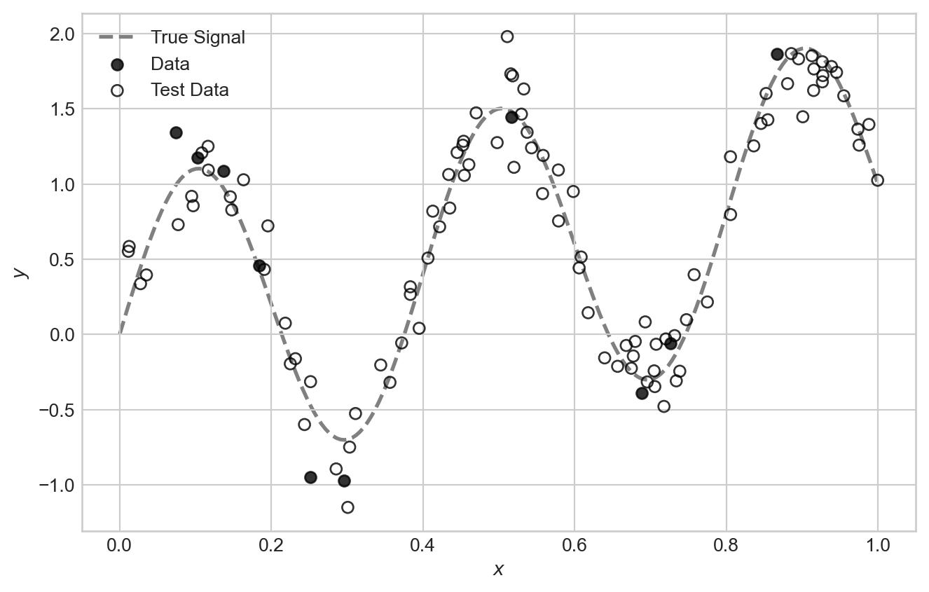 ax.scatter(x_test, signal_test + noise_test, alpha=0.8, label="Test Data", color='k', facecolors='none')