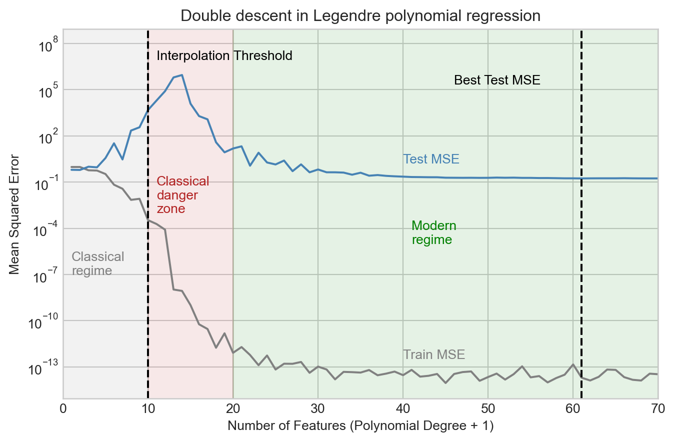 ax.set_title(f"Double descent in Legendre polynomial regression")