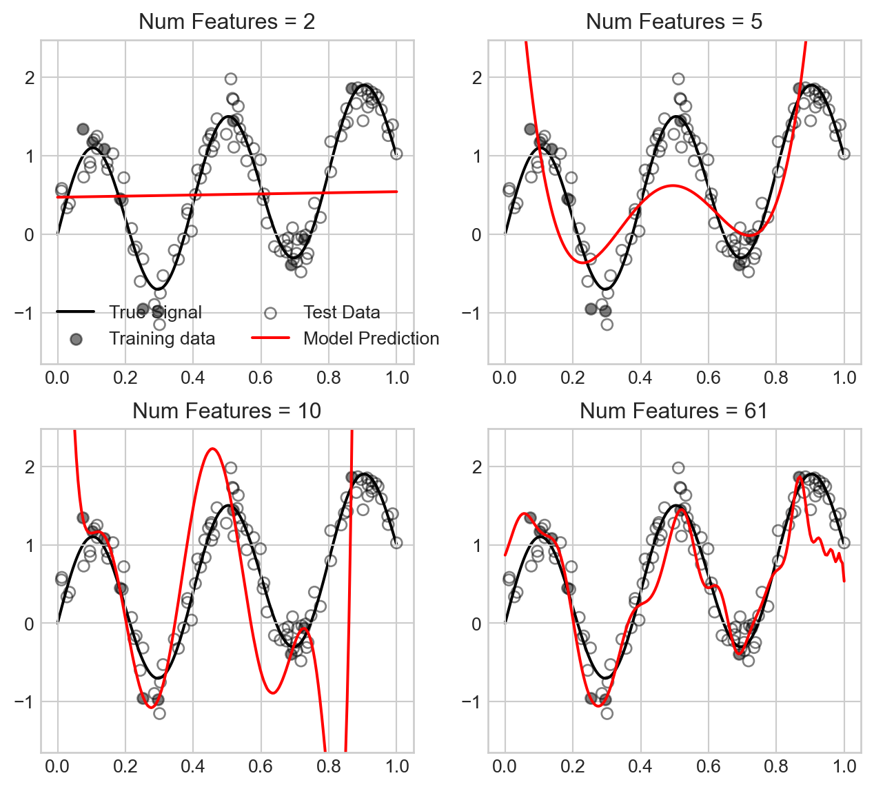 For several decades, the received wisdom in the statistics and machine learning communities was that models begin to overfit when they become “too complex.” Model complexity is frequently measured in terms of the number of parameters present in the model. So far in these notes, we’ve exclusively studied models where the number of parameters is equal to the number of features, so another way to think about model complexity is in terms of the total number of features.