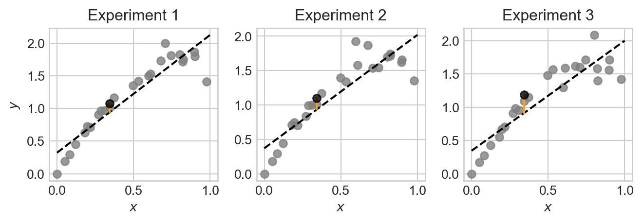 Note that, although each plot is somewhat similar, the data points, fitted model, and prediction at the test point are all slightly different across the three experiments. This is because the data we pull in each experiment is random, which causes the fitted model and resulting prediction to also be random.