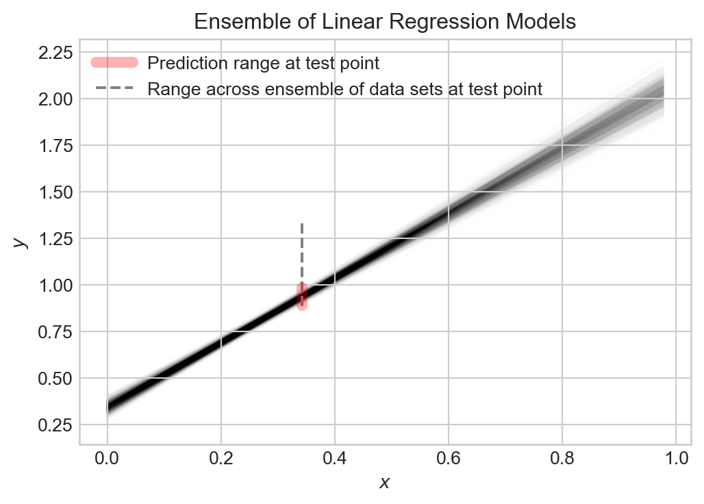 ax.plot([x[test_point_ix], x[test_point_ix]], [targets[:, test_point_ix].min(), targets[:, test_point_ix].max()], color='grey', label="Range across ensemble of data sets at test point", zorder = 100, linestyle='--')