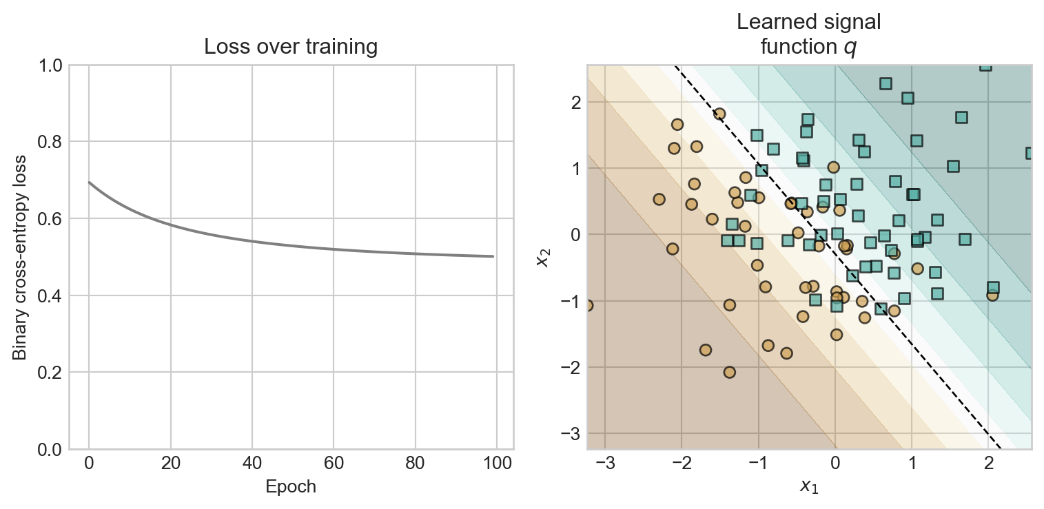 where here we are letting \(\mathbf{q}(\mathbf{X}) = (q(\mathbf{x}_1), q(\mathbf{x}_2), \ldots, q(\mathbf{x}_n))\) be the vector of predicted probabilities for each data point. We’d like to find a choice of the signal function \(q\) that makes this loss as small as possible, which as usual is equivalent to maximizing the log-likelihood.