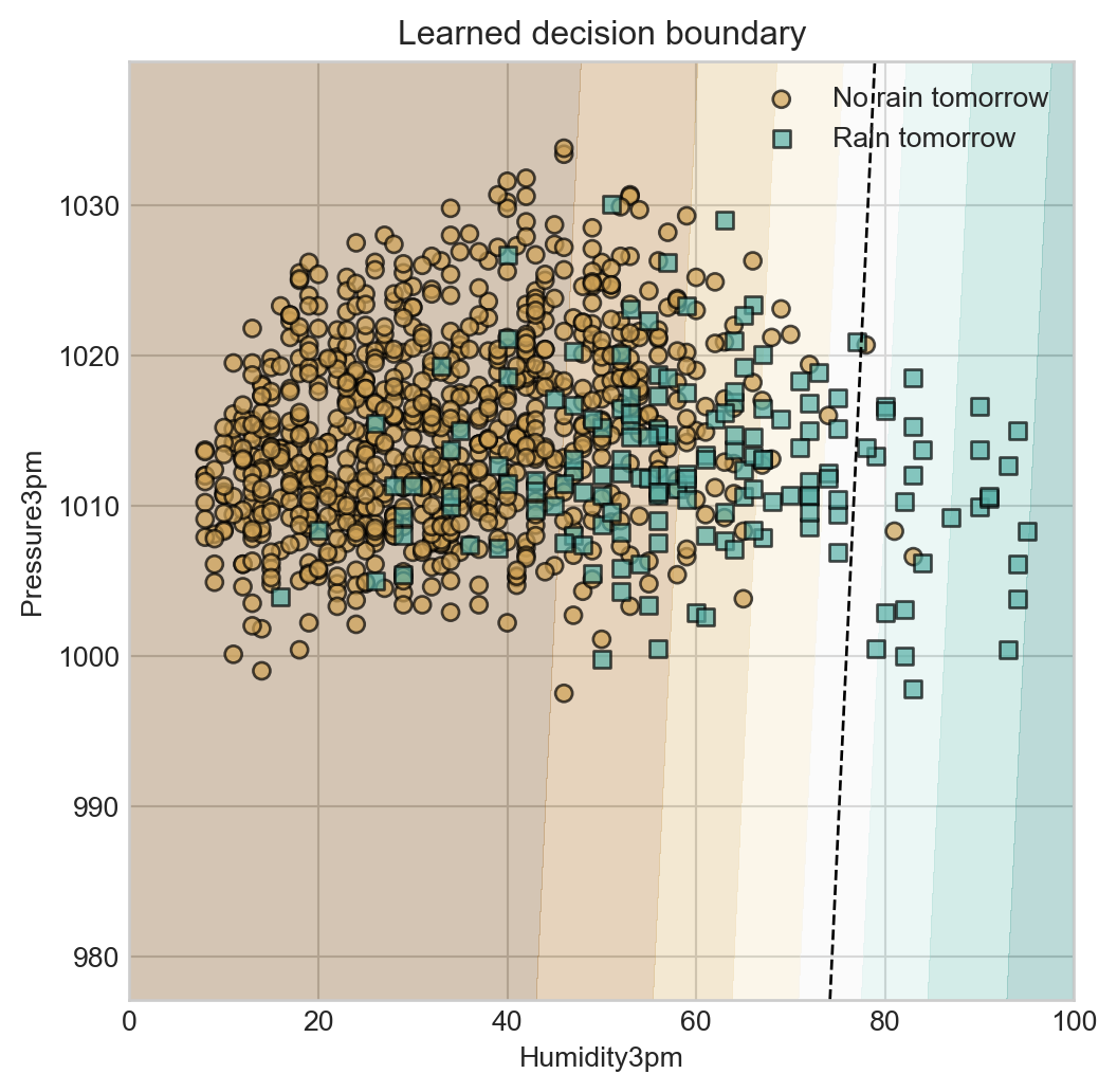 ax.set(title='Learned decision boundary', xlabel='Humidity3pm', ylabel='Pressure3pm')