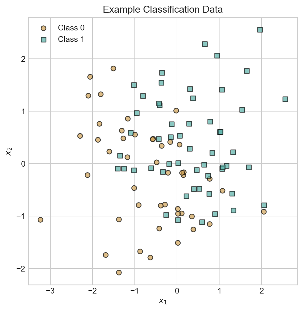 t = ax.set(title='Example Classification Data', xlabel=r'$x_1$', ylabel=r'$x_2$')We are going to conceptualize this data as arising according to the following process: