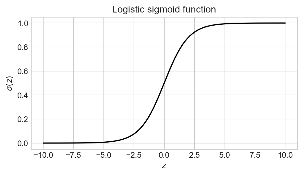Definition 6.3 (Logistic Sigmoid) The logistic sigmoid \(\sigma: \mathbb{R}\rightarrow (0, 1)\) is the function with formula