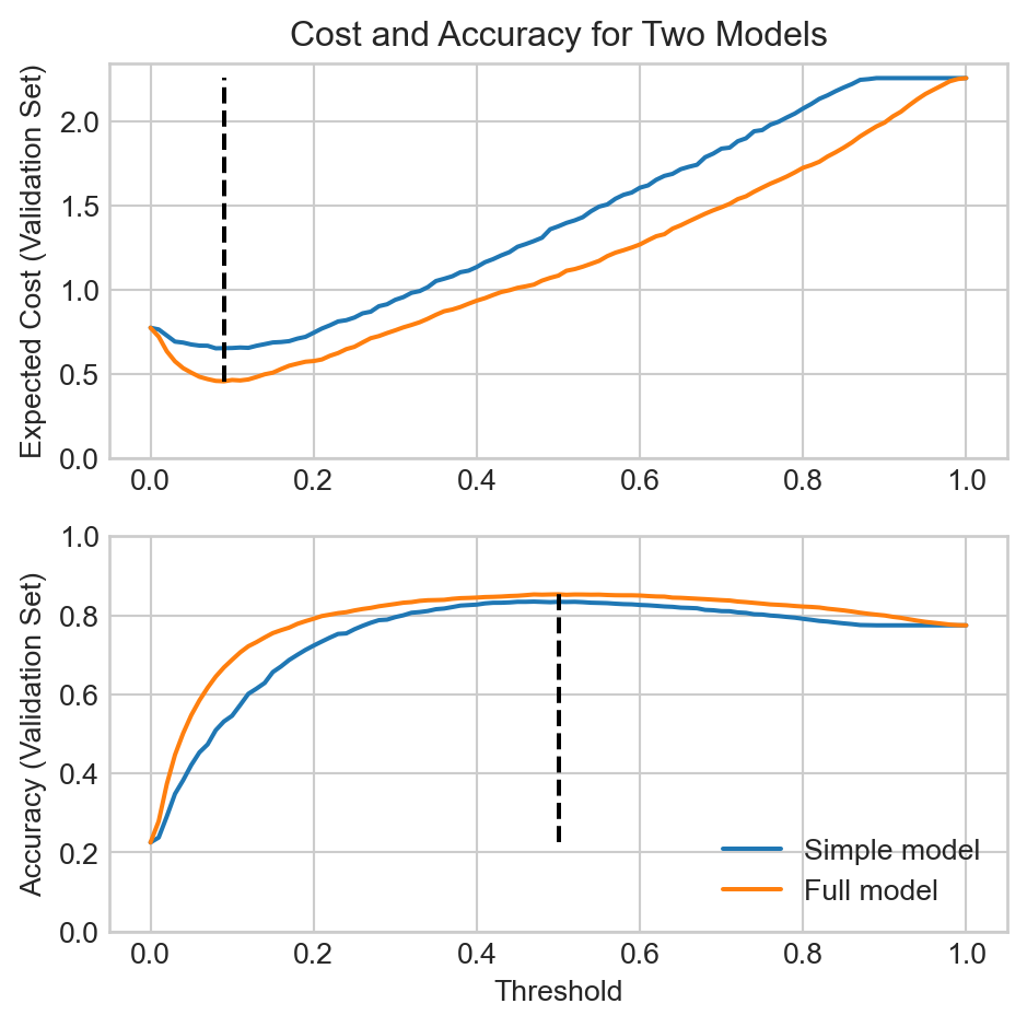 On the other hand, the cost matrix \(\mathbf{C}\) that we used in this experiment assigns a very high cost to false negatives. This means that the expected cost favors models that more frequently predict positives, which corresponds to lowering the threshold. However, in the low-threshold region of the threshold space, the full model is considerably more accurate than the simple model, which in turn means that the full model has a much lower expected cost than the simple model in this region.