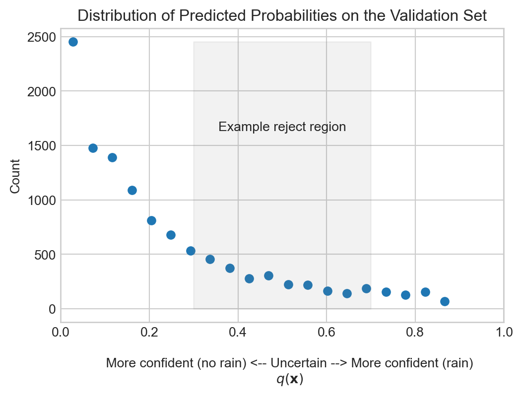 In many application settings, it may be desirable for a model to have an option to “reject” or decline to make a prediction. For example, a model that predicts whether or not a tumor is malignant may be used to help a doctor decide what treatment to recommend. In some cases, the model may be very uncertain about its prediction for a given patient, and it may be desirable for the model to have the option to “reject” making a prediction for that patient, and instead pass the data off to a human expert for further analysis. The process of manual analysis likely to be more expensive than the automated prediction of the model, but is also likely to be more accurate.