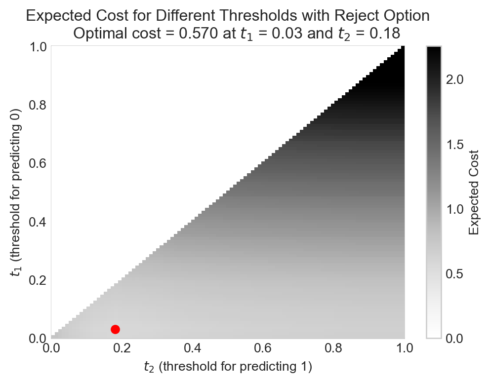 As before, we can use the expected cost to help us select the thresholds \(t_1\) and \(t_2\), but this time our expected cost becomes more complex. We need to define the two thresholds that we’ll use to define the positive, reject, and negative regions of prediction. We’ll also need to supply the optimal threshold for the full model.