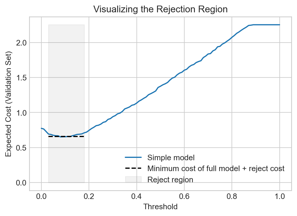 print(f"{min(costs_full) + reject_cost:.3f} = expected cost of using full model all the time (including cost of querying full model)")0.653 = expected cost of using simple model all the time