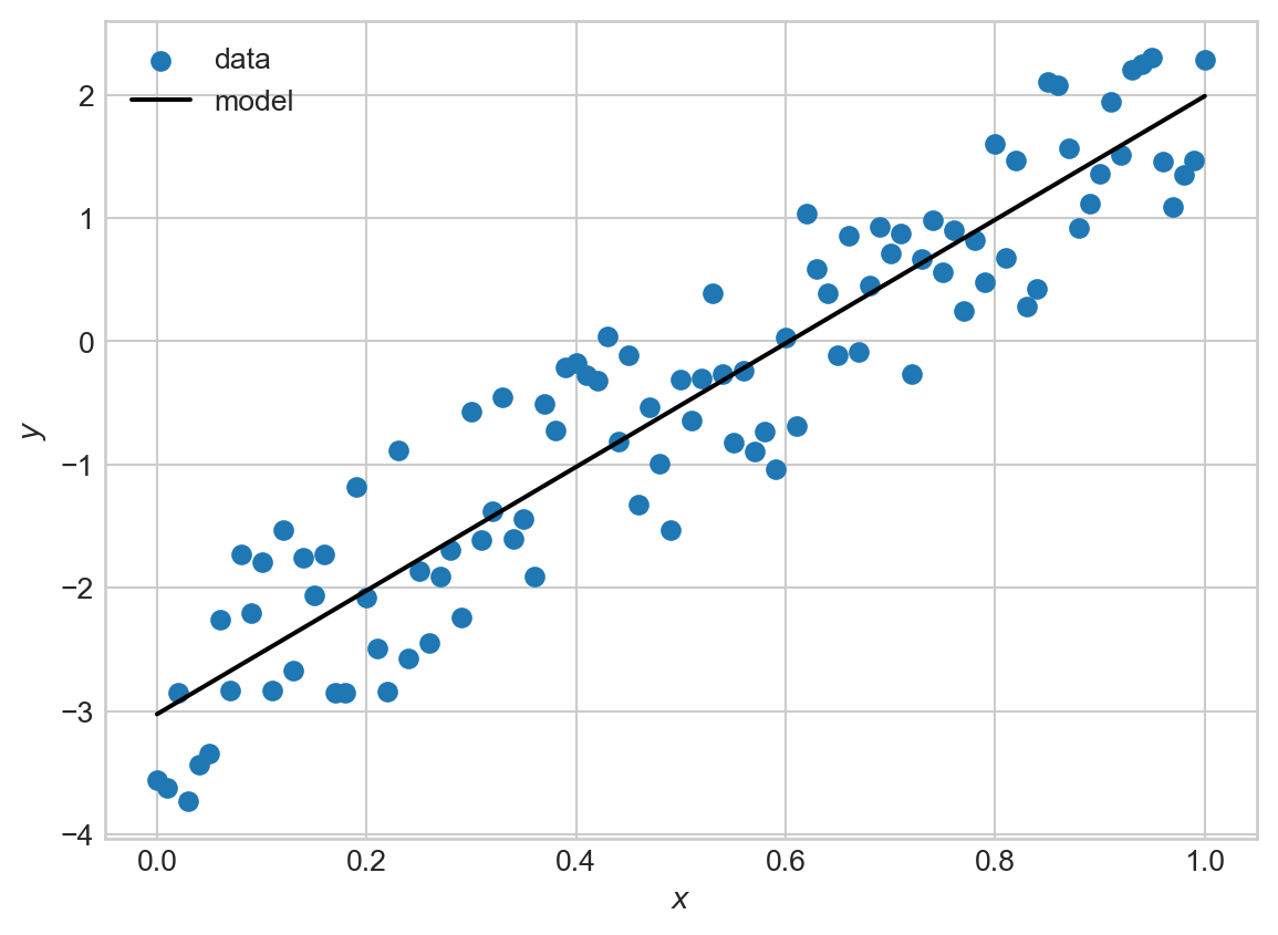 We’ve recovered parameters close to the expected ones, with no manual computation of derivatives! We can also visualize the fit of our model:
