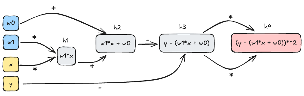 The key idea here is to start from the output node in the computational graph and work backwards. For example, let’s compute the gradient of the MSE function with respect to \(w_0\) and \(w_1\). We’ll start with the output node \(h_4\) and work backwards, using the chain rule as we go.