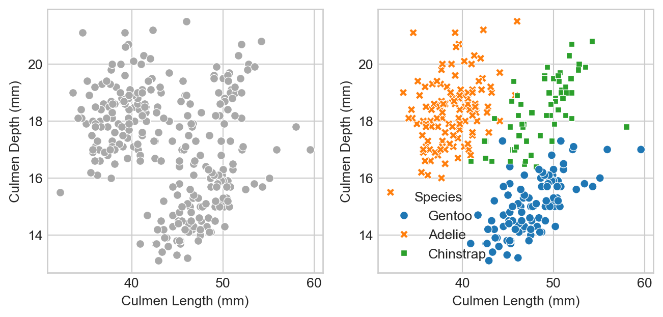 We can think of the lefthand side as “what the model will see:” just physiological measurements with no labels. On the right we can see the data with its species labels included. We can see that the species are divided into clusters: Adelie penguins have measurements which tend to be similar to other Adelies; Chinstraps are similar to other Chinstraps, etc.