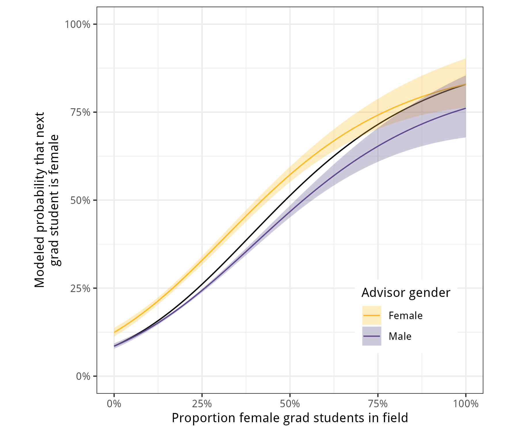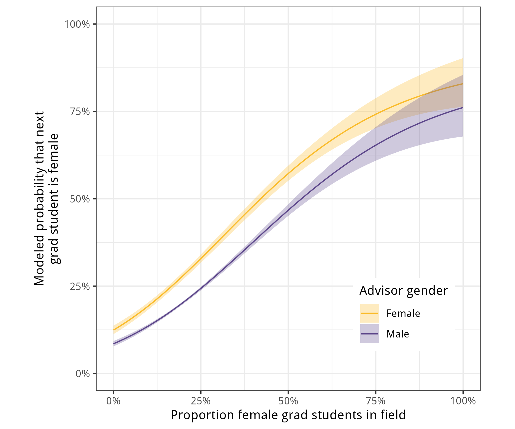Both the gender of a students’ specific advisor and the overall proportion of female advisors in the subfield’s population contribute to the likelihood that the student is female.