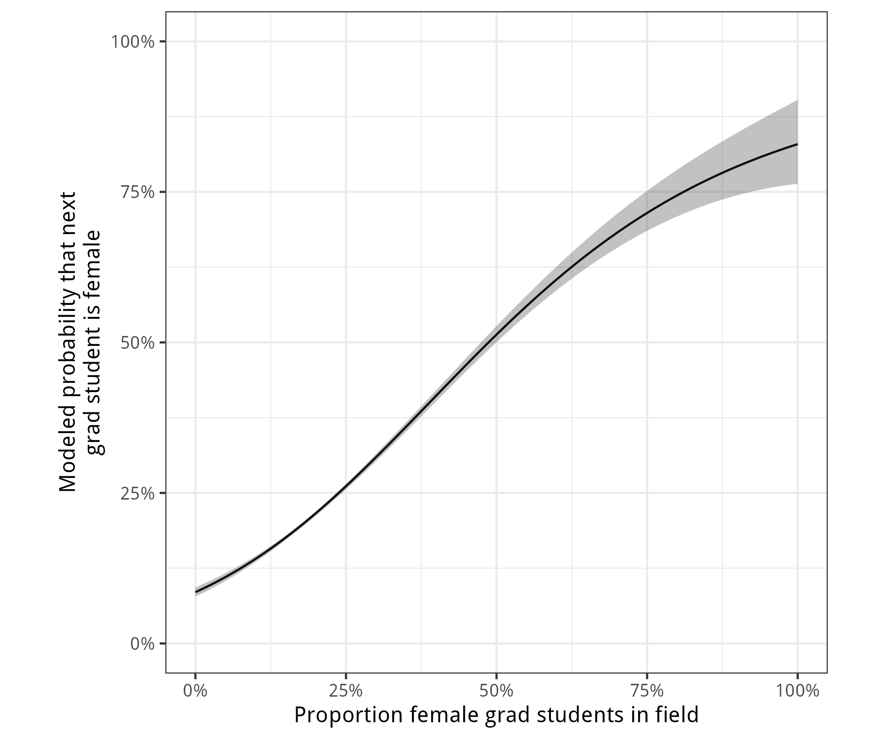 \[ \begin{aligned} \log (\text{odds F}) = & \beta_0 + &\quad \beta_0 &= -3.30 \; (0.05)\\ & \rho \times (\text{advisor is F}) + &\quad\rho &= \phantom{-}0.42 \;(0.02)\\ & \gamma_1 \times (\text{proportion F advisees in group}) + &\quad \gamma_1 &= \phantom{-}1.49\; (0.16)\\ & \gamma_2 \times (\text{proportion F advisees in group})^2 + &\quad \gamma_2 &= -0.51 \;(0.24)\\ & \eta_{1} \times (\text{proportion F in subfield}) + &\quad \eta_1 &= \phantom{-}4.16 \; (0.33)\\ & \eta_{2} \times (\text{proportion F in subfield})^2 &\quad \eta_2 &= \phantom{-}1.53 \; (0.51) \end{aligned} \]