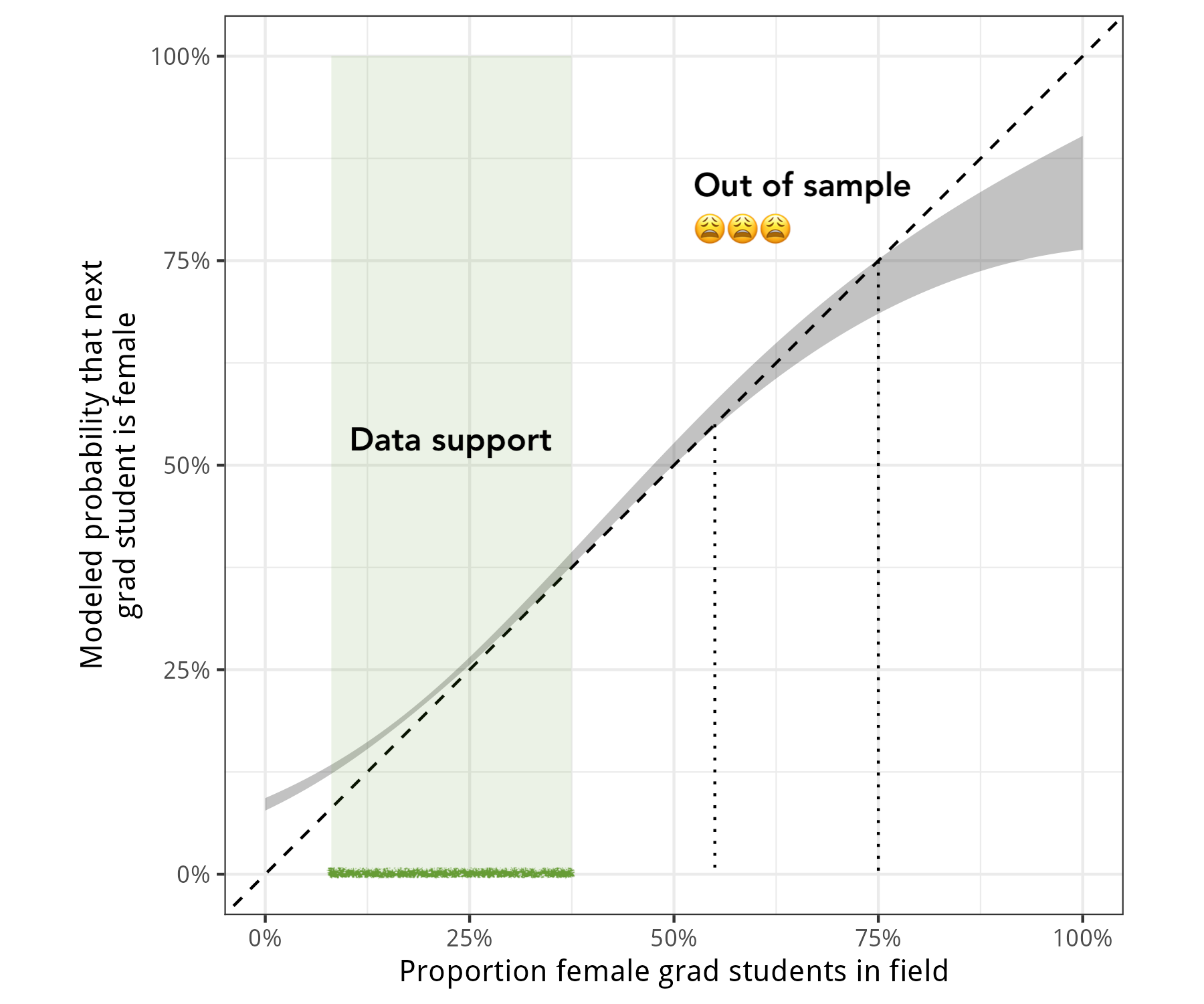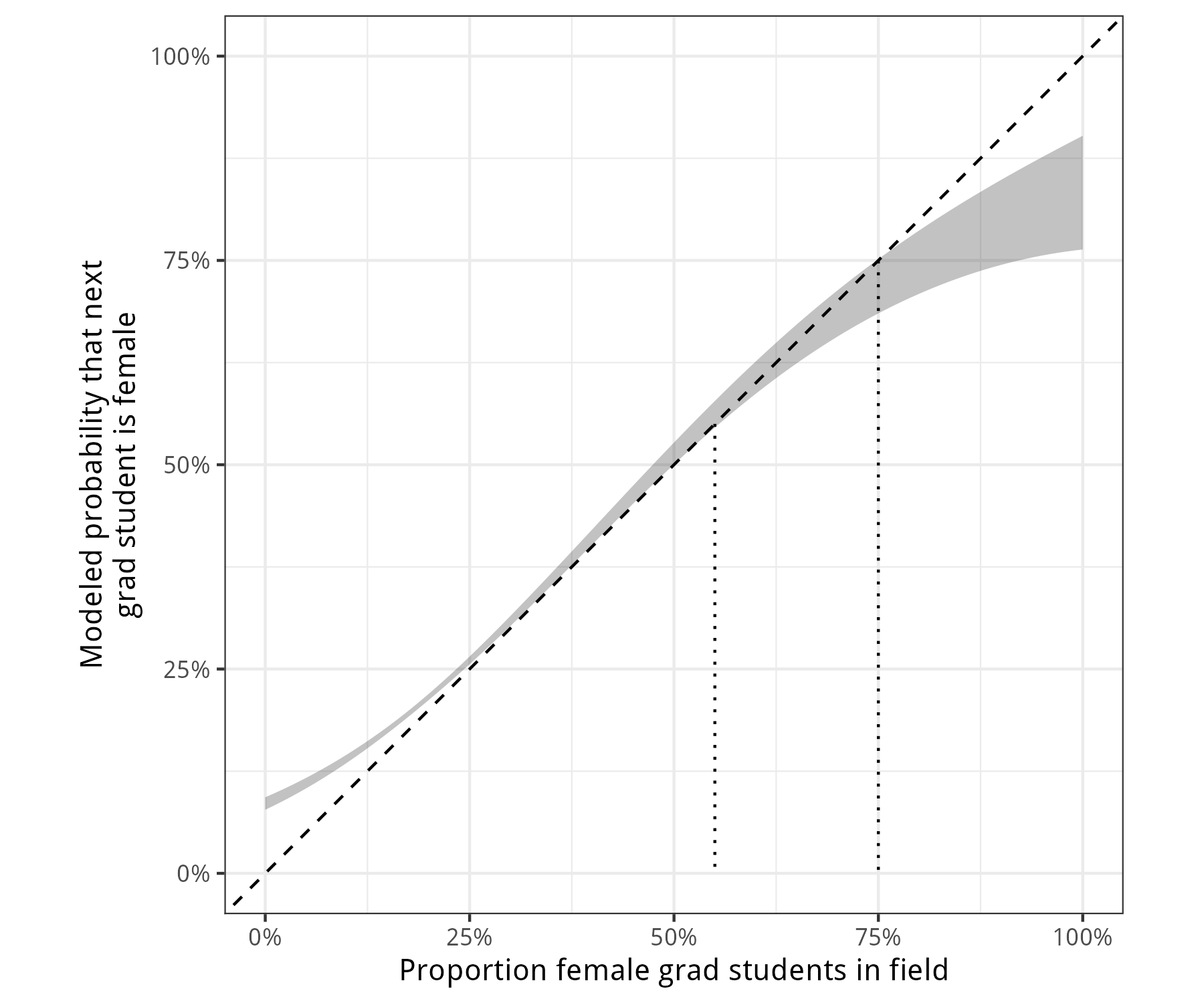 If \(p^*\) is the stationary proportion of graduates in the subfield, then \(p^*\) approximately satisfies \[ \begin{aligned} p^* = \color{#ffaf03}{w_f}\color{#ffaf03}{\sigma_f}(p^*) + \color{#5b427c}{w_m} \color{#5b427c}{\sigma_m}(p^*) \end{aligned} \]