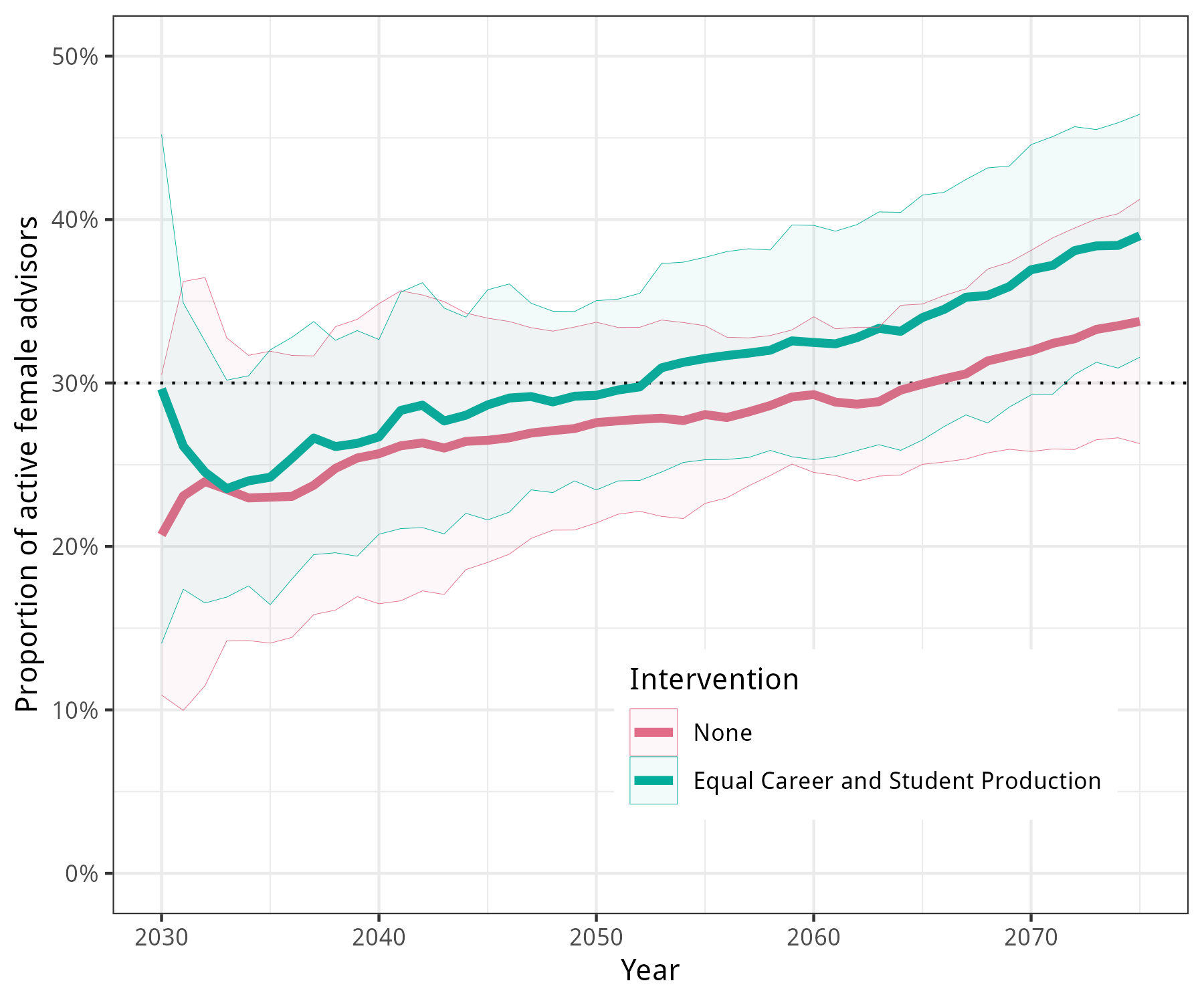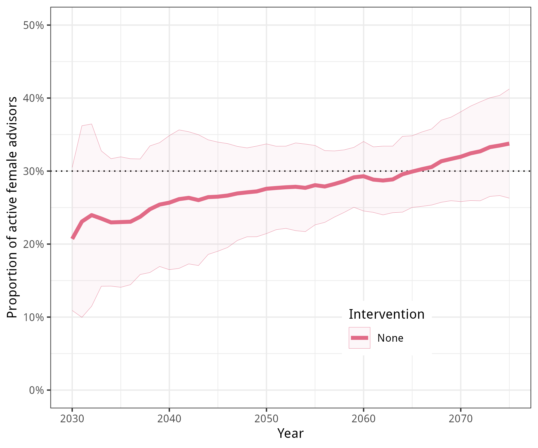 10 simulations initialized with 1,000 active advisors, 20% female.