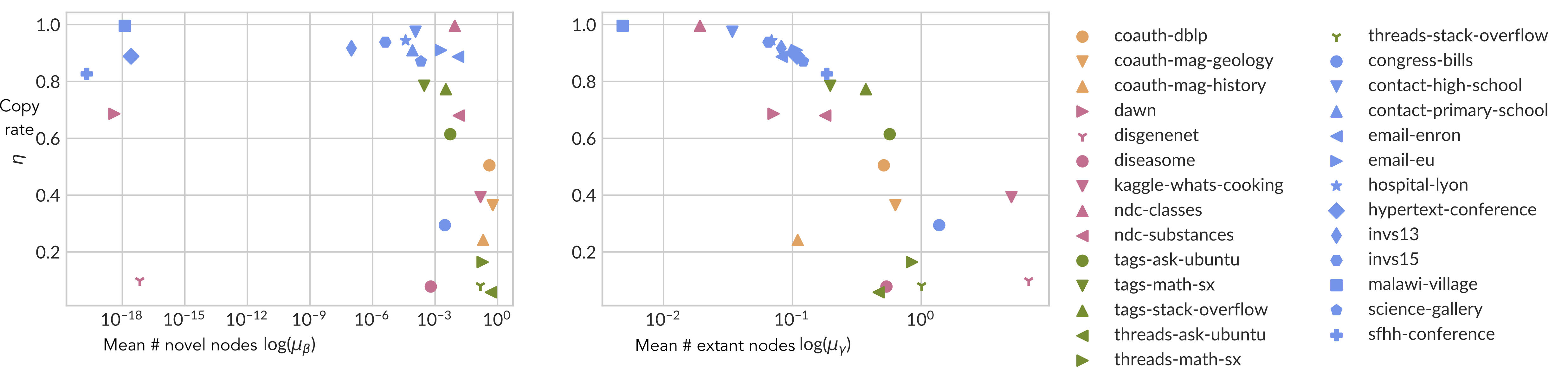 Coauthorship networks have lower copy rates and higher rates of both novel and extant node addition.