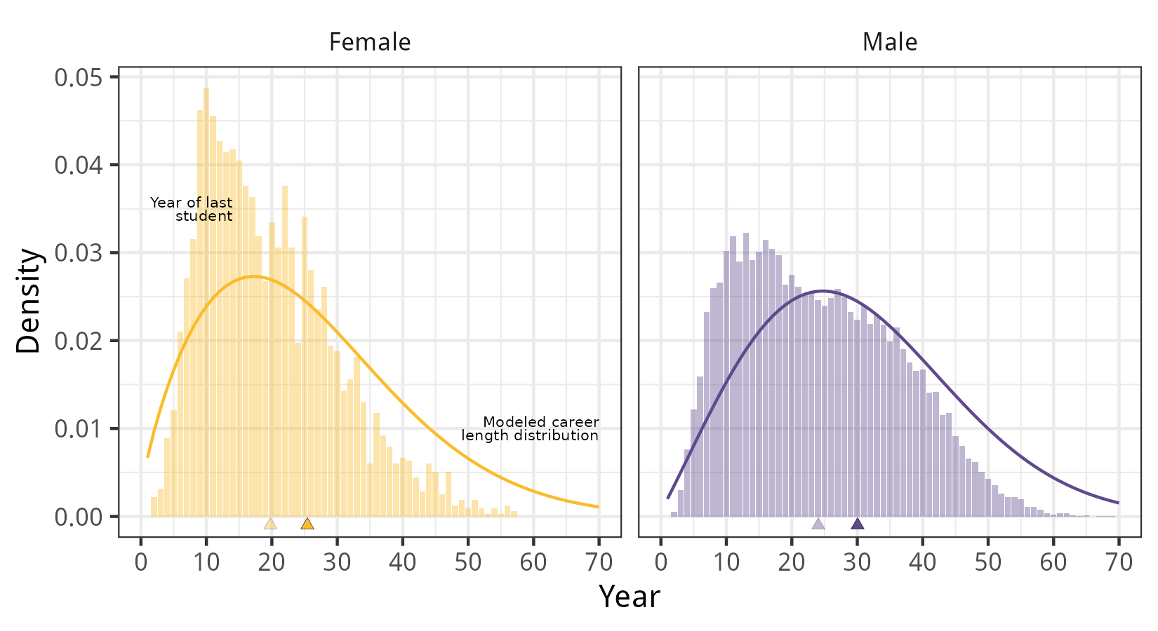 We hypothesize that greater student production per year by male advisors reflects unequal access to research resources; cf. Zhang et al. (2022)