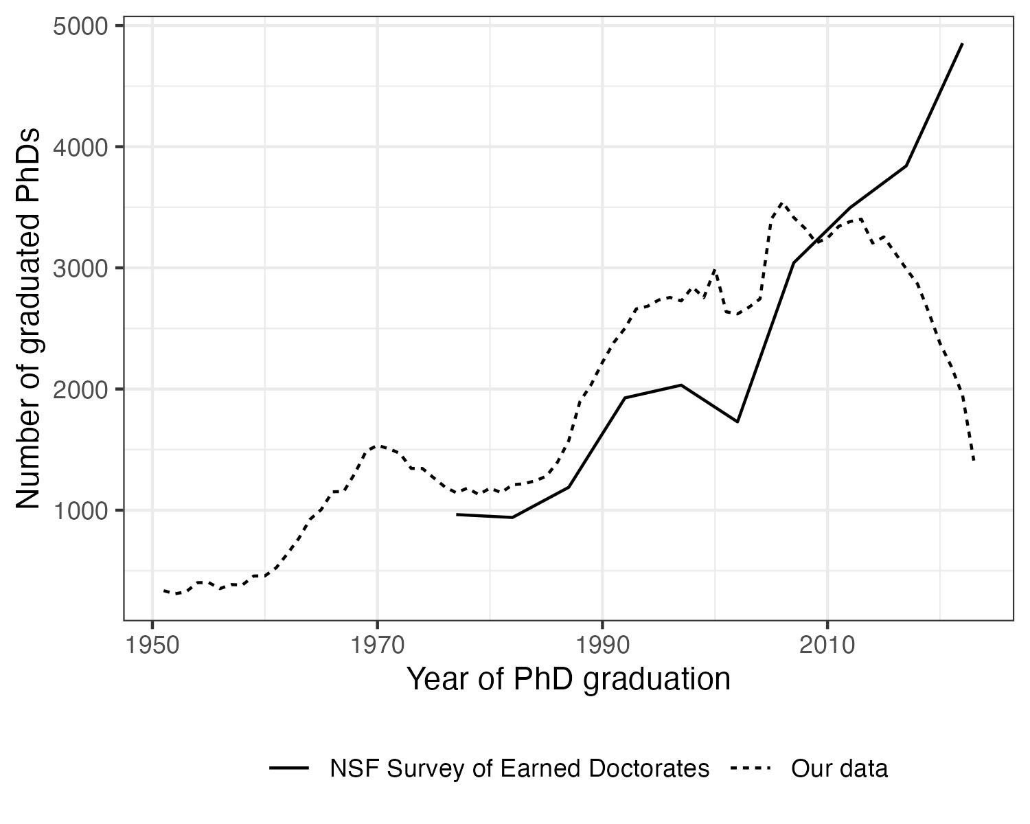 Total of 116,306 advisor-student pairs in the US since 1950, representing 21,781 distinct advisors. We observe or estimate math subfields for 94% of these pairs (predictions based on thesis titles). We estimate gender for 95% of PhD students and 97% of advisors.