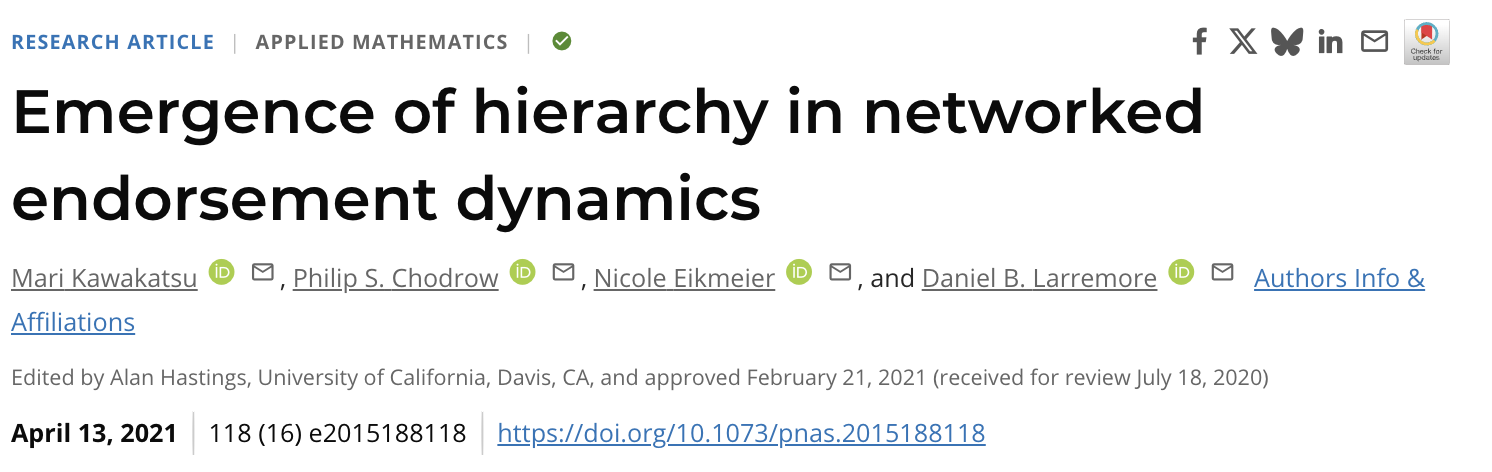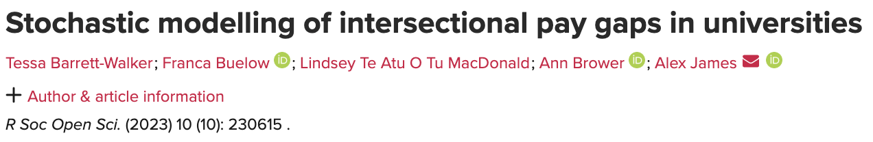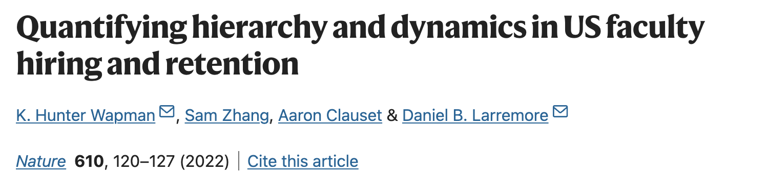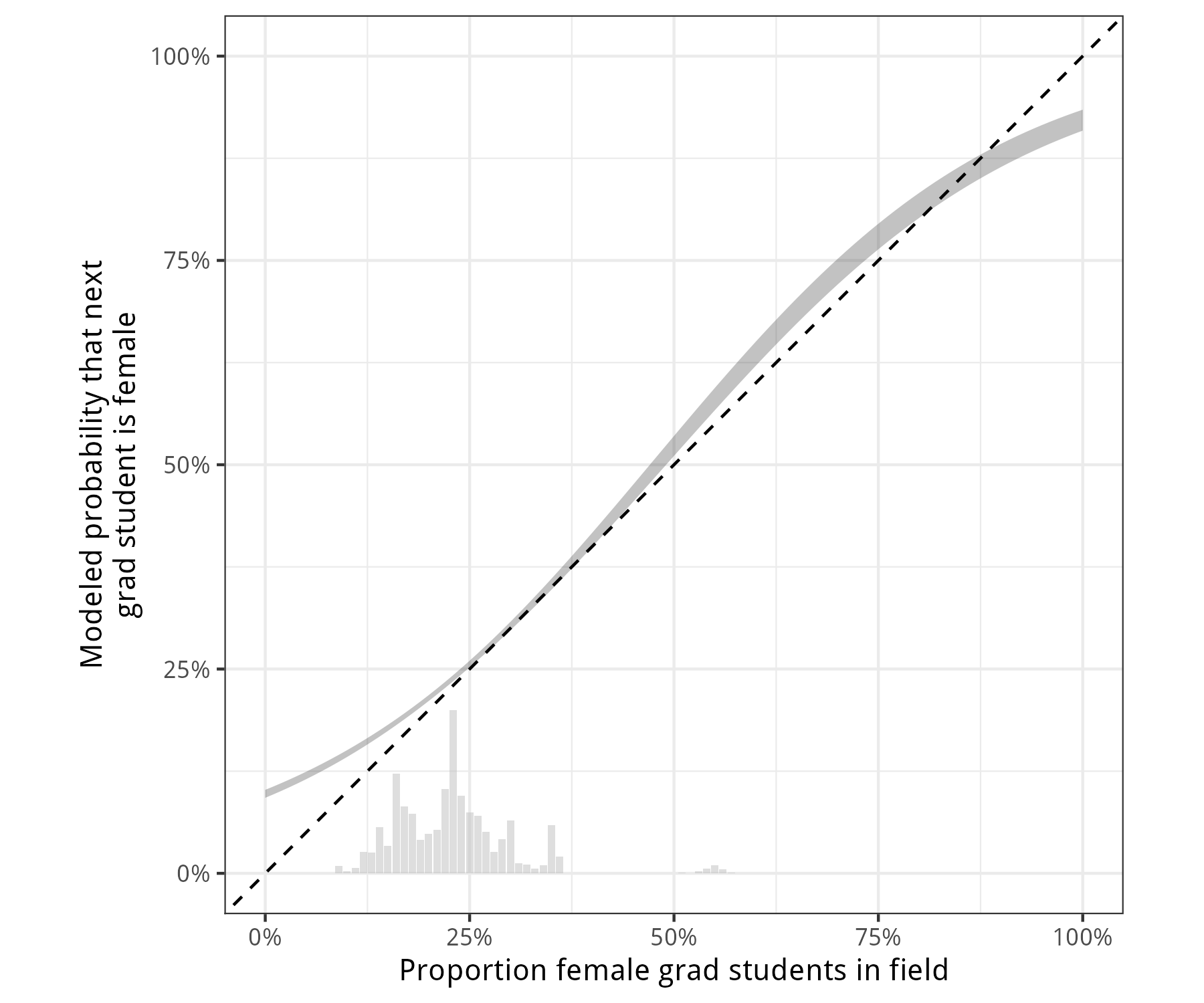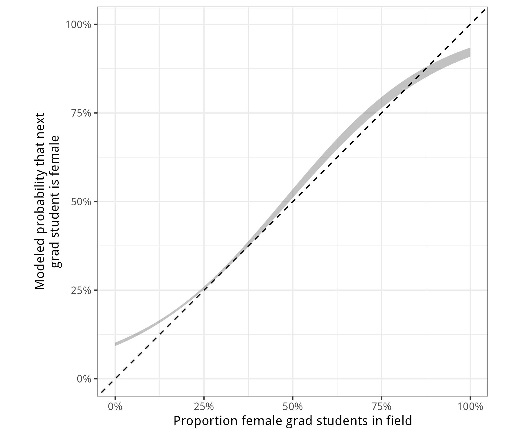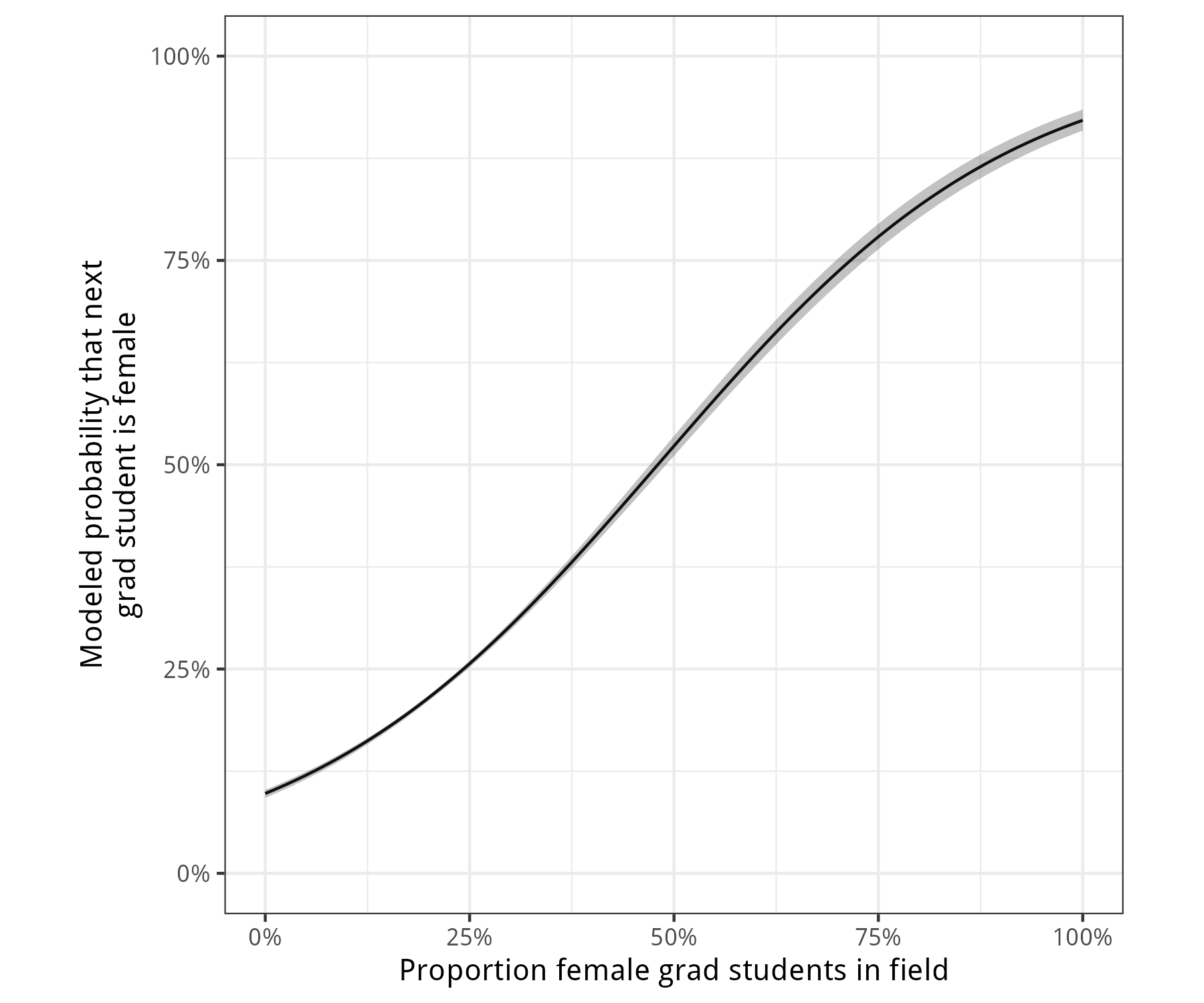 \[ \begin{aligned} \log (\text{odds F}) = & \beta_0 \;+ &\quad \beta_0 &= -2.14 \; (0.04)\\ & \rho \times (\text{advisor is F}) \;+ &\quad\rho &= \phantom{-}0.42 \;(0.02)\\ & \gamma \times (\text{proportion F advisees in group}) \;+ &\quad \gamma &= \phantom{-}1.16\; (0.06)\\ & \eta \times (\text{proportion F in subfield}) &\quad \eta &= \phantom{-}3.27 \; (0.12)\\ \end{aligned} \]