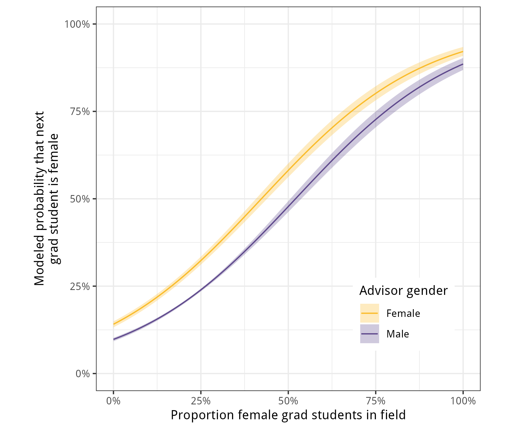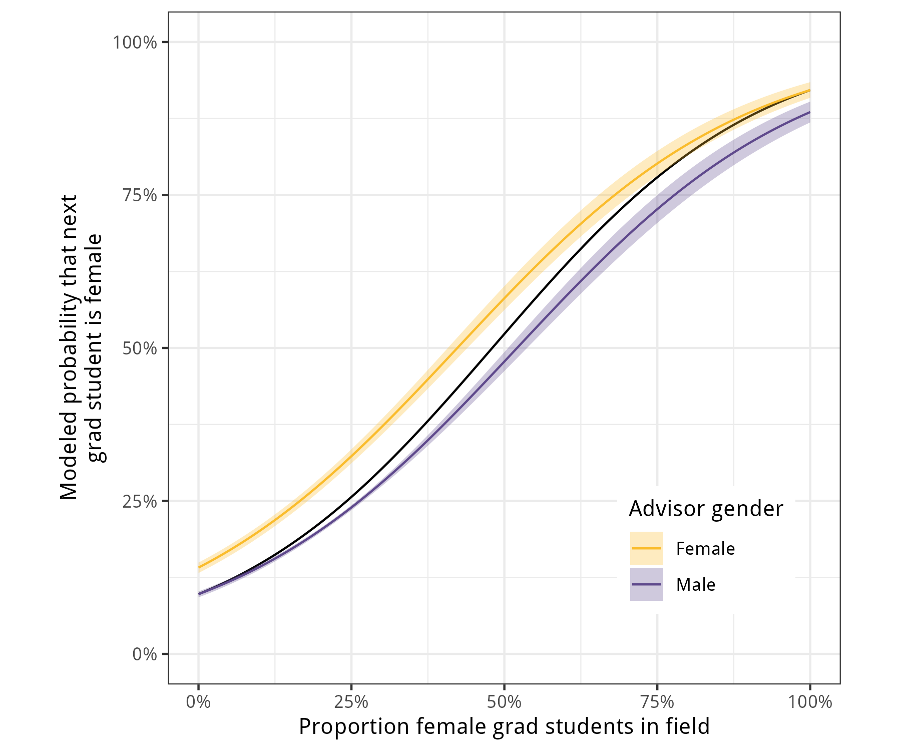 Both the gender of a students’ specific advisor and the overall proportion of female advisors in the subfield’s population contribute to the likelihood that the student is female.
