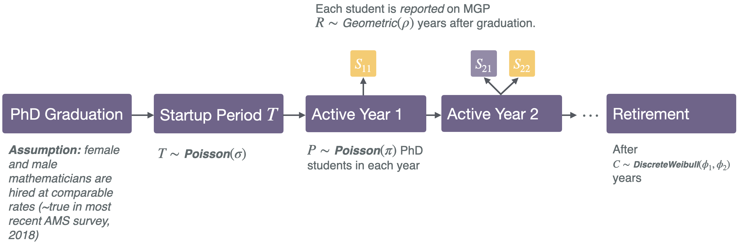 We model an observed sequence of students \(\color{#086788}{\mathbf{S}} = (\color{#086788}{S}_1, \color{#086788}{S}_2, \ldots, \color{#086788}{S}_T)\) produced by an advisor as a function of an unobserved advisor career \(\color{#07A0C3}{C}\) specified by the startup period length and retirement year.