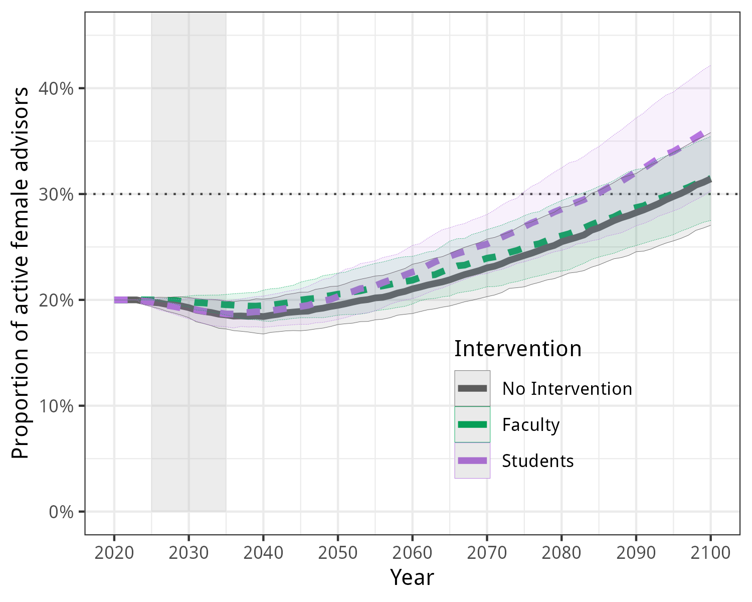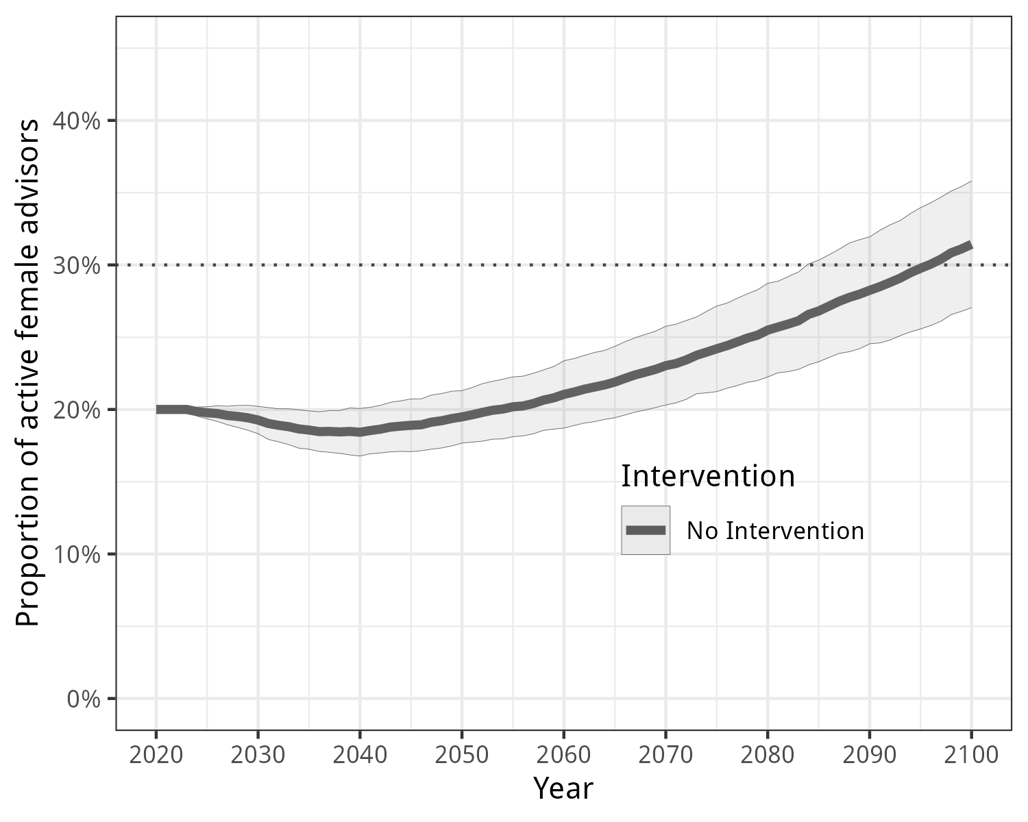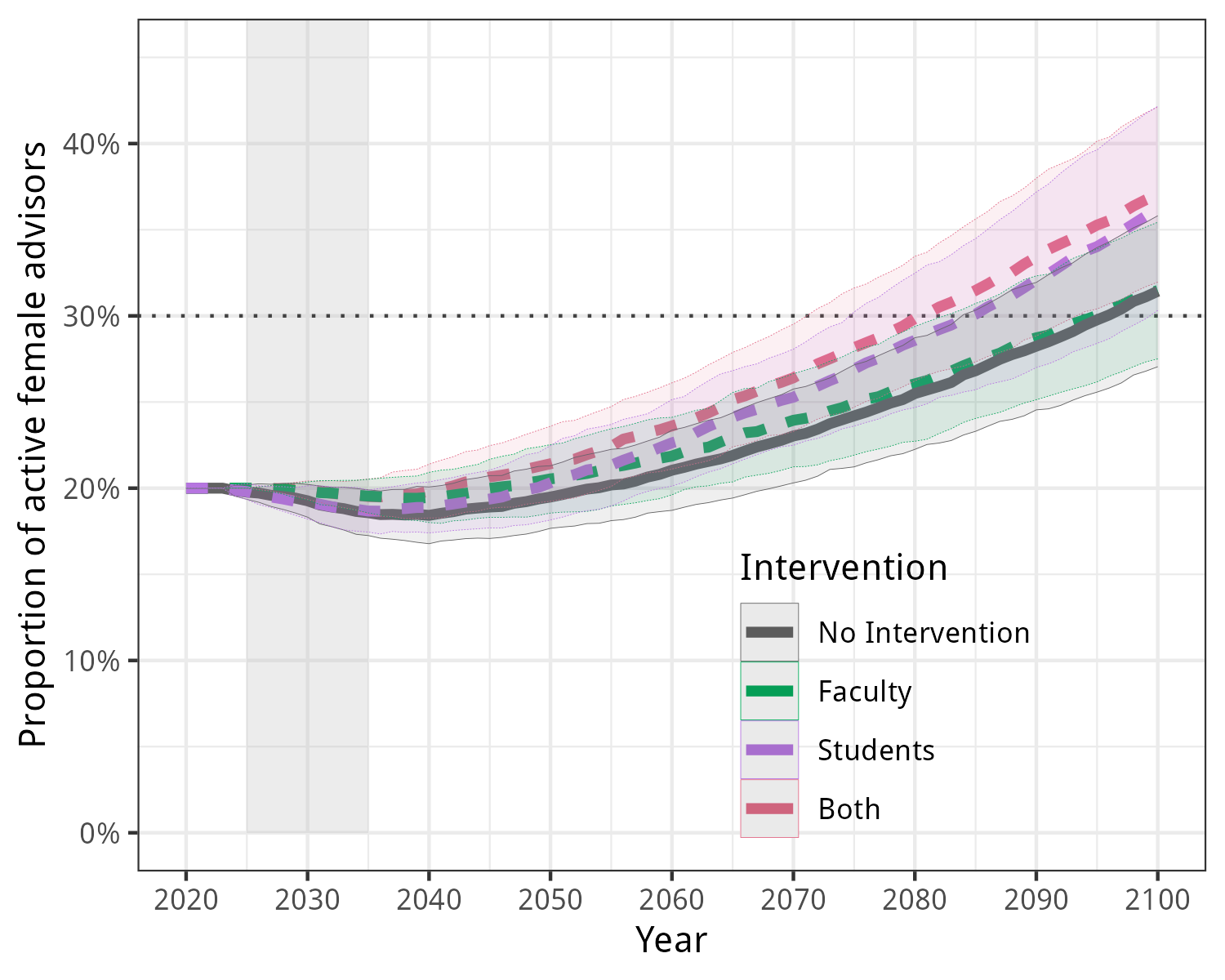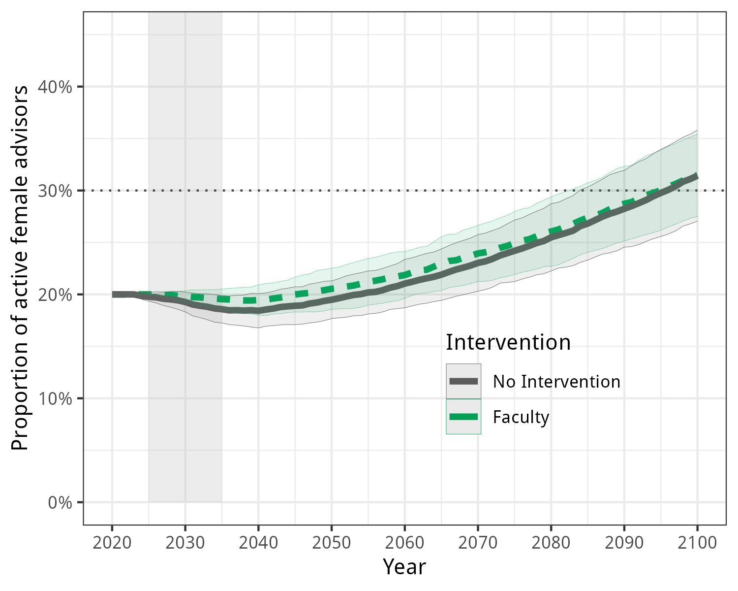 100 simulations initialized with 1,000 active advisors who received PhDs over period 1980-2000, 20% female.